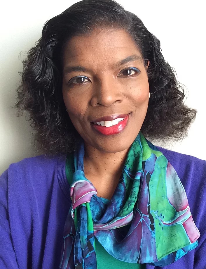 Image Description: Dr. Paulette Richards, in a purple top and multi-colored scarf looks into her camera for this self portrait.