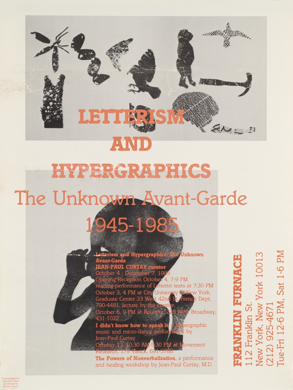 The official poster for the exhibition: Letterism and Hypergraphics: The Unknown Avant-Garde 1945–1985, held at Franklin Furnace between October 4 and December 7, 1985.