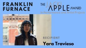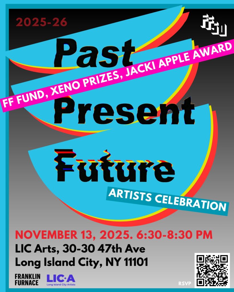 Thursday, November 13, 2025, 6:30– 8:30 pm ET at Franklin Furnace’s new location in Long Island City, a celebration of this year’s 12 Franklin Furnace grant recipients from three categories: the FUND for Performance Art, the XENO Prizes for Performance Art and Artist’s Books, and the Jacki Apple Award in Performance and Artist Projects.