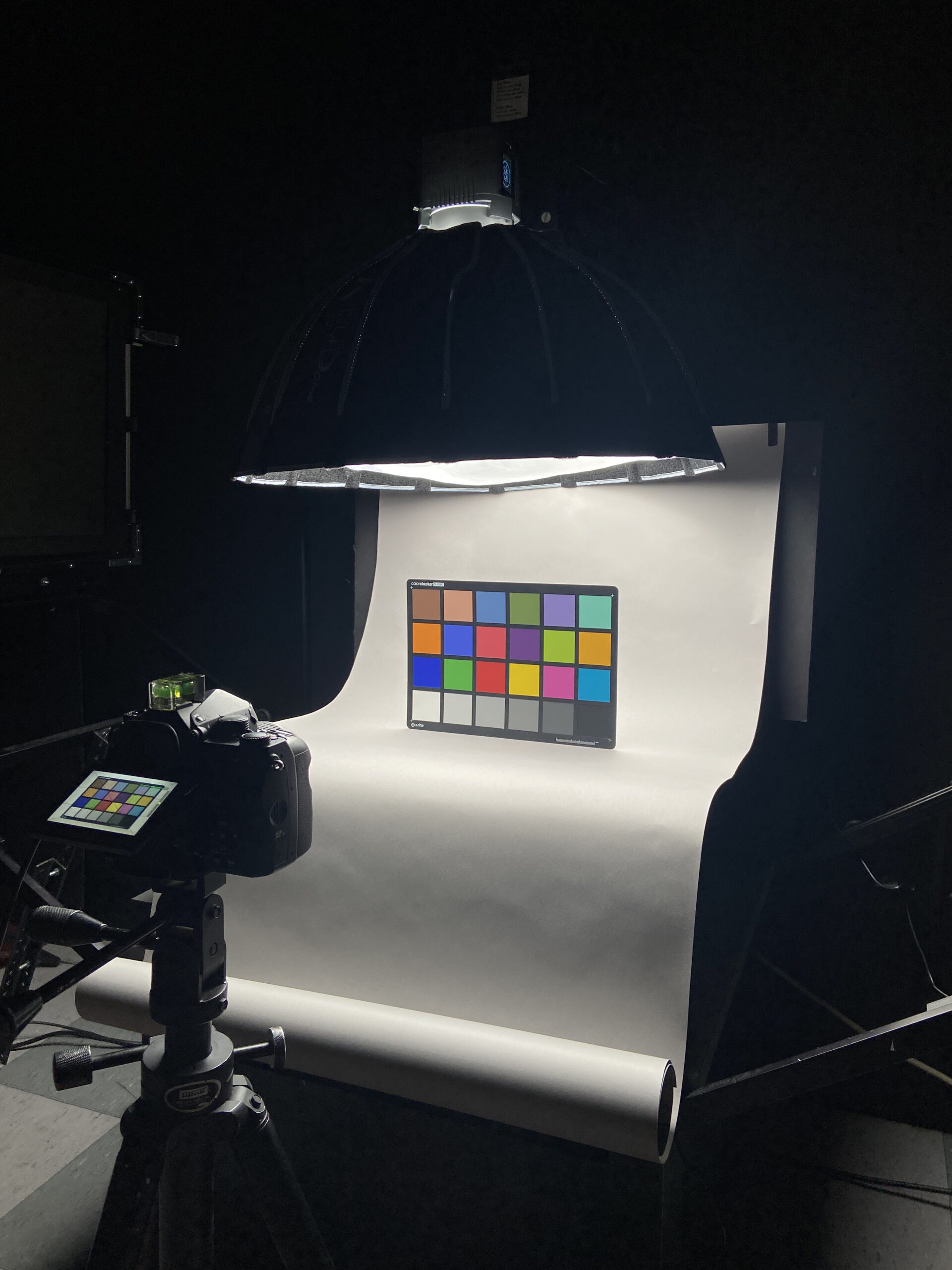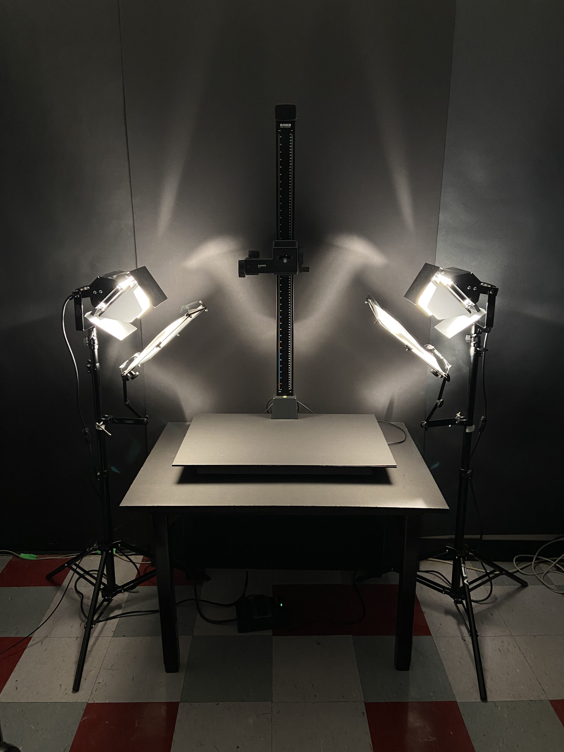 A slide copier and a lightbox were used specifically for photographing every slide and slide sheets. Additionally, a pull-down retractable backdrop has been prepared to convert a desktop into a tabletop studio setup for documenting three dimensional contents.