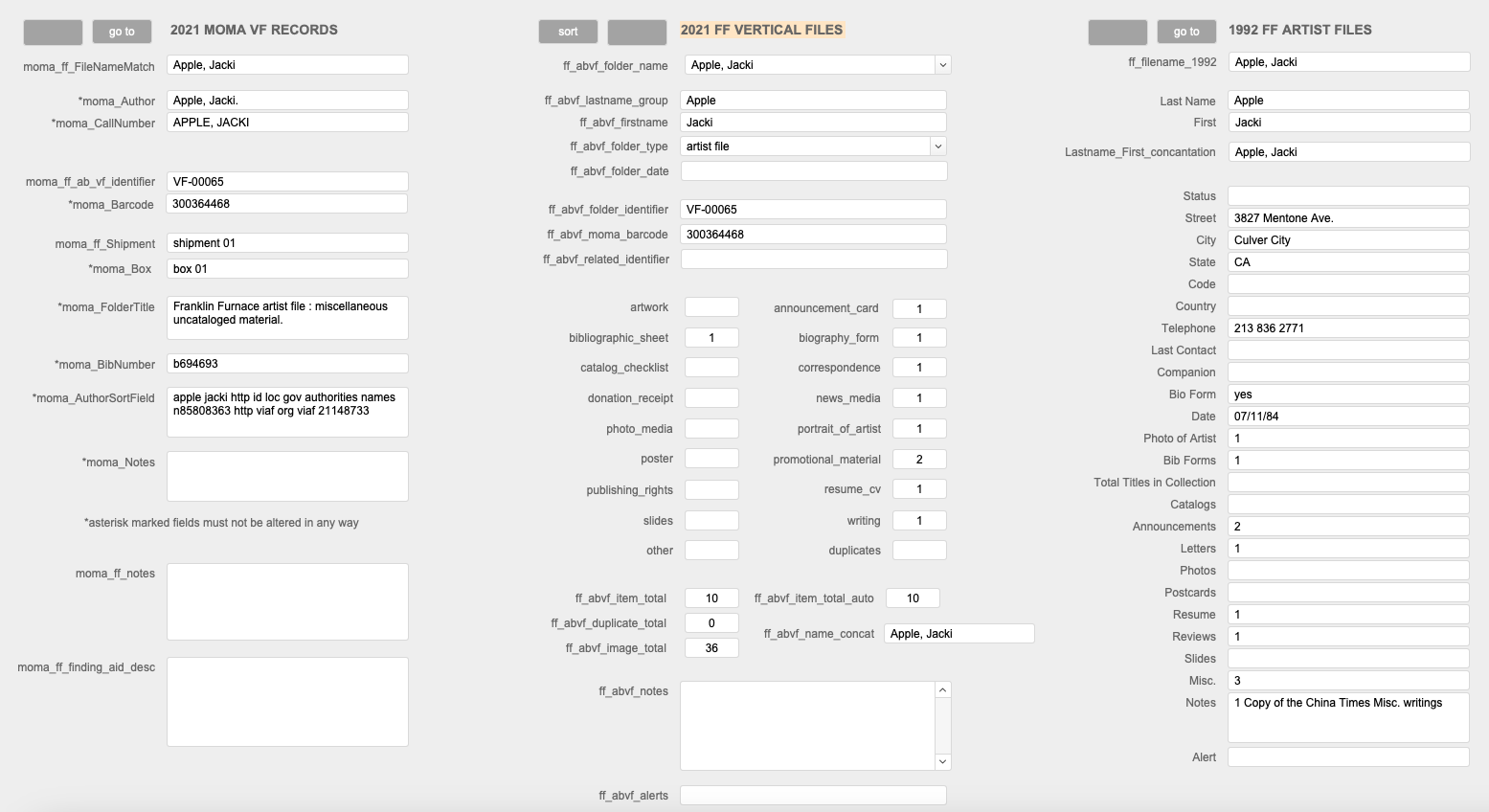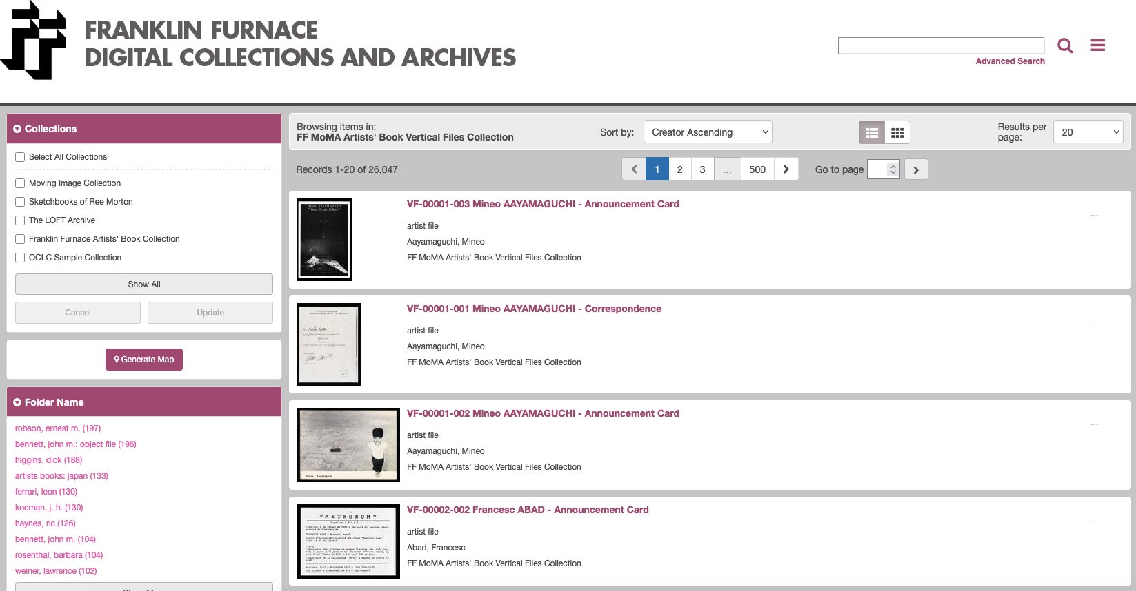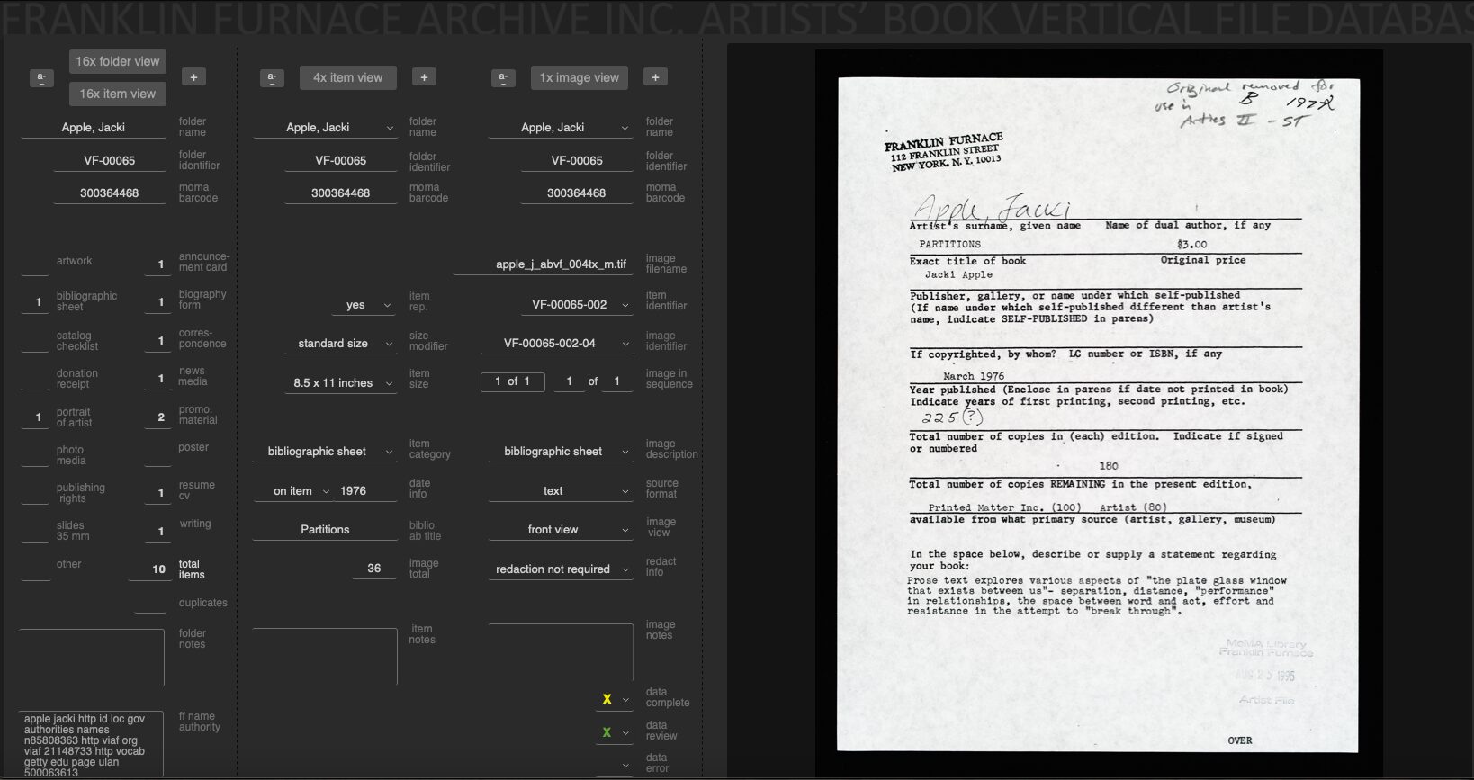 For digital asset management (DAM) Franklin Furnace uses FileMaker Pro as it has done since 1997. A project database is created by combining the metadata from two sets of independently created folder-level catalog records of the vertical files, one created by Franklin Furnace and one created by MoMA. The original Franklin Furnace 1992 database was created prior to the first set of the collection being transferred to MoMA, including folder names and approximate item counts. MoMA re-processed the collection and provided their own identification for each folder to help maximize interoperability with MoMA’s physical storage.