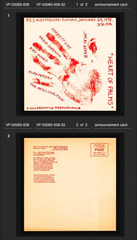 These newly available resources are enabling innovative research and providing long-term benefits for artists, scholars, researchers, students, and the general public. Franklin Furnace’s Vertical Files project ensures in perpetuity the long-term availability of these primary resource materials and their discoverability – all the digitized materials are published on the CONTENTdm database and available online.