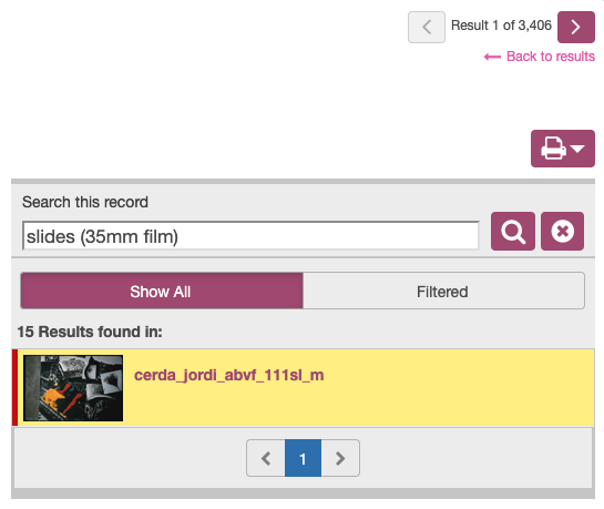 You can navigate the search results by clicking the arrows on the top right corner of the item record page. Click “back to results” to return to the list of results. To print an item record, click on the print icon below “back to results”.